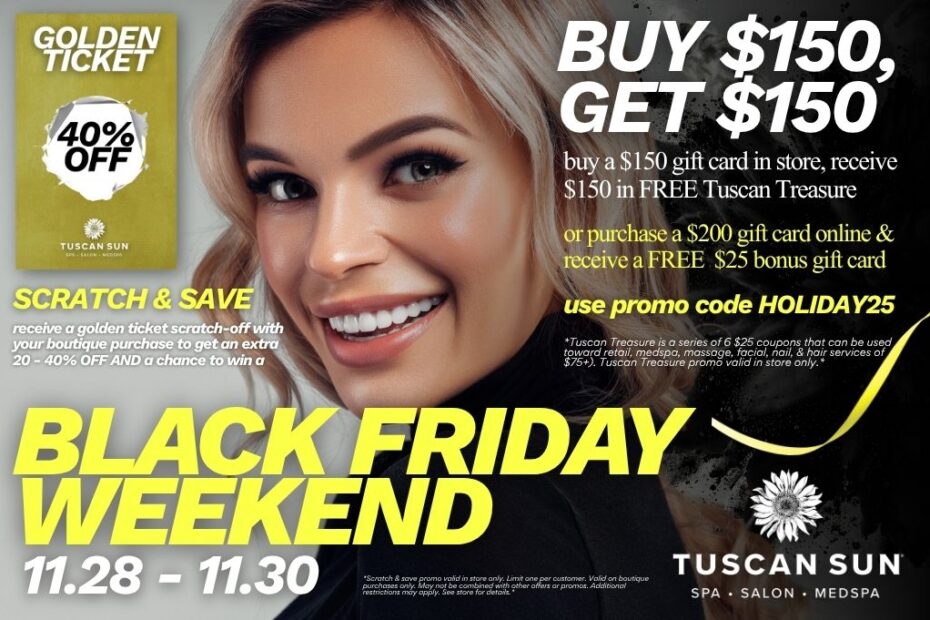 Join us at Tuscan Sun for our Black Friday Weekend Friday, November 28th through Sunday, November 30th! We have lots of SPA-mazing specials all weekend long!